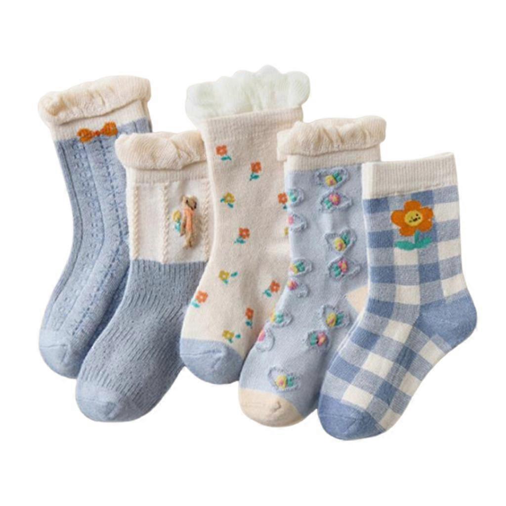 5 Pairs Kids Girls Winter Warm Cotton Crew Socks Ruffled Trim Cute Kawaii Colorful Floral Pattern Cable Knitted Children Casual Mid Tube Hosiery