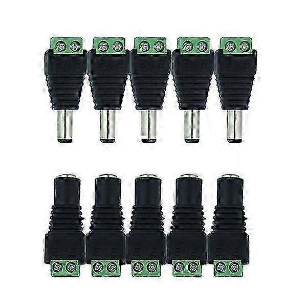 Description These connectors are items for LED strips and and DC connectionsto the 12V power supply. Easy to install. Simply plug on to adapter and connect 2 led strip light wires. Male and female, screw terminal and bare wire options. Suitable for security, and surveillance camera use, video supply, and electronic recorder. Features - Color: Mainly black - Shell material: PVC Plastic and Electric Parts - Internal diameter 2.1mm - External diameter 5.5mm - Rated voltage: 12V - Support power for LED RGB Strips, DC connect using, CCTV camera accessories, such as video supply, and electronic recorder. - Reliable connect and good performance. No electrical tap, No splicing, no crimping, but only a small screw driver. - Screw terminal strip for connecting power wires. - Perfect solution for those who want to make custom power cable. - Easy to install. Simply plug on to adapter and connect 2 led strip light wires.Packing list: 5 x Male Connector 5 x Female Connector Note: Due to the light and screen setting difference, the item's color may be slightly different from the pictures. Please allow slight dimension difference due to different manual measurement.