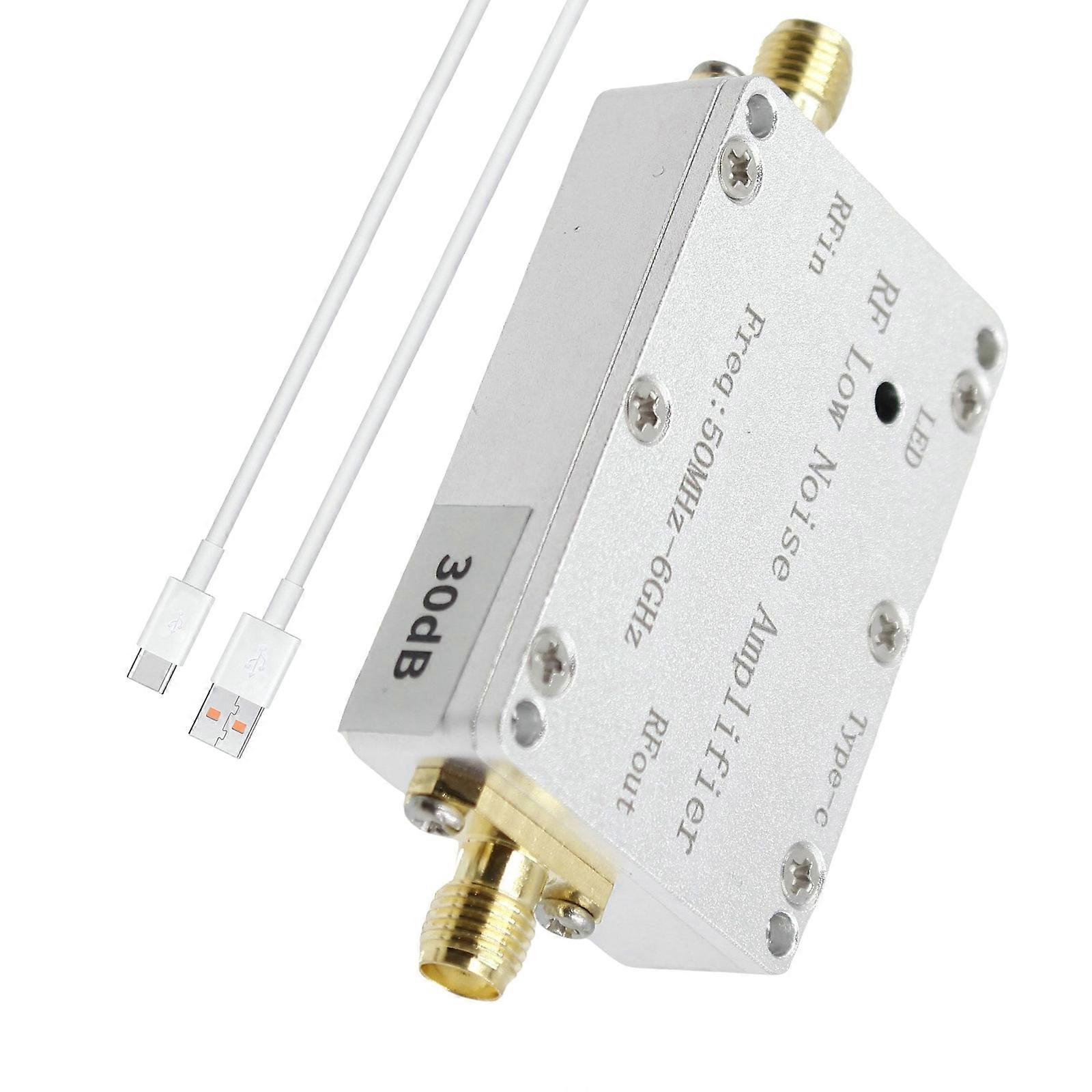 Features: The RF low noise Amplifiers module is used for small signal reception and amplification of 50M-6GHz receiver system, covering the wide-band ranges of VHF, UHF bands. As a pre-microwave signal receiving module, it have the characteristics of high gains and low noise figure. The module is power by USB C+5V, with power indicator. The Amplifiers module is used for signal Gains promotion and small signal amplification in various radio transmitters and receivers.. This Amplifiers module boasts high gains and impressively low noise figure of 2.4dB Specifications: Component:Metal Type:20DB/30DB/ Working voltages: +5V single power supply Power interfaces: USB C. Working current: 20dB-35mA 30dB-80mA Operating frequency: 50M-6GHz P1dB output power: +10dBm@3GHz; +16dBm@3GHz; Noise figure: 2.4dB Size:Approx.6.5x2.54cm/2.56x1inch Package Includes: 1 Set RF Amplifiers note: 1.Please allow 1-2cm errors due to manual measurement, making sure that you not mind before order. 2.Due to the differences between different monitors, the picture may not reflect the actual of the item.