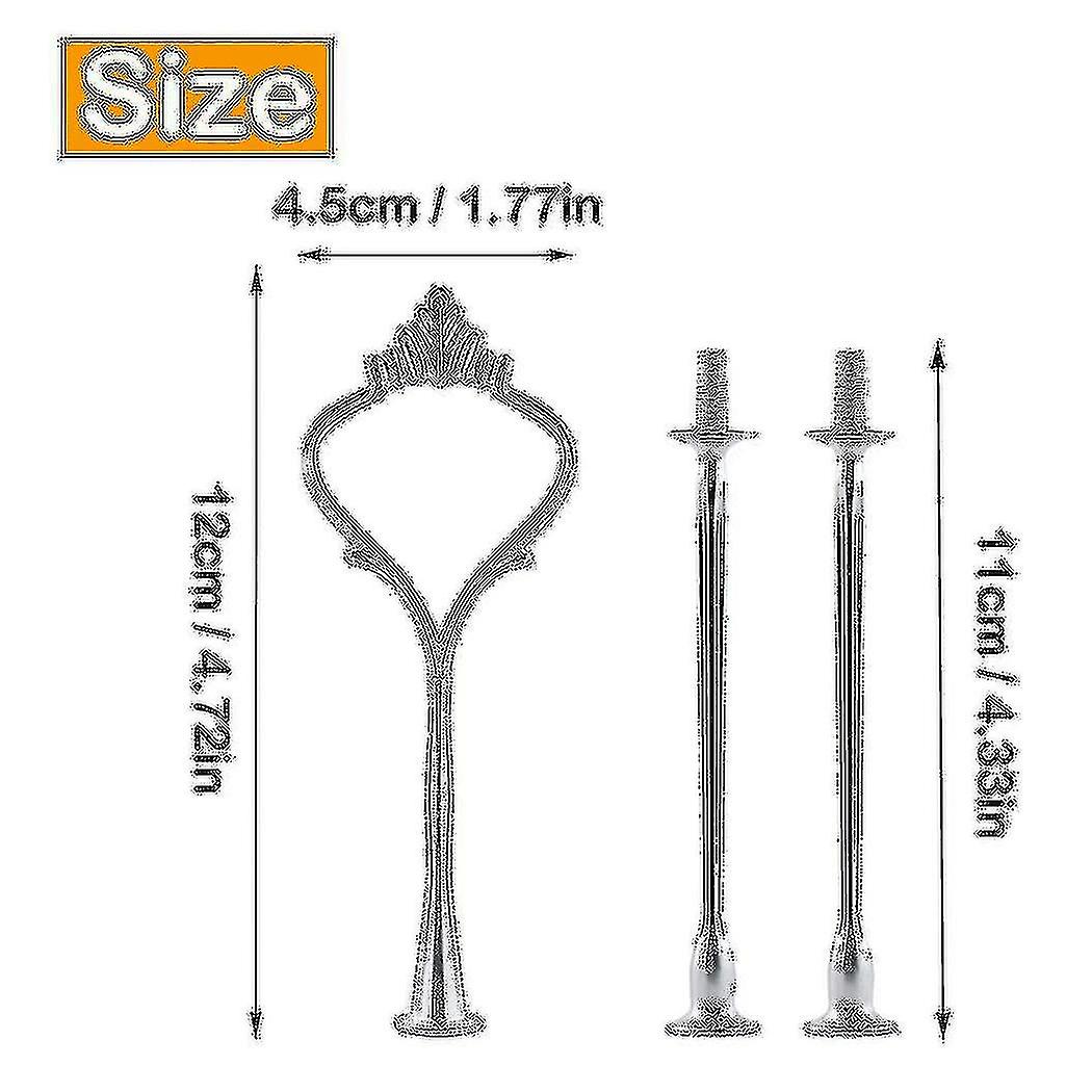 [High-quality materials] Cake stand accessories are made of high quality material. Smooth, reusable, not heavy but strong enough to ensure the stability of the bracket.[Simple assembly] Just install the layered tray on the cake stand, connect the parts, and tighten all the parts within a few minutes. It can be disassembled when not in use, which is convenient for storage and carrying.[Different combinations] These cupcake holders can be installed in 2 or 3 layers, or more stacked according to your needs.[Wide use] The tray holder is suitable for fixing handmade cake trays. You can use this cake stand to make exquisite fruit plates, jewelry plates, cake stands for weddings and New Year parties.[NOTE]Only Cake stand fittings, does not include trayscolour:SilverMaterial:Zinc alloysize:Approximately 12 x 4.5cmPackage Contents:6 x silver bracketsOnly the above package content, other products are not included.Note: Light and different displays may cause the color of the item in the picture a little different from the real thing. The measurement allowed error is +/- 1-3cm.