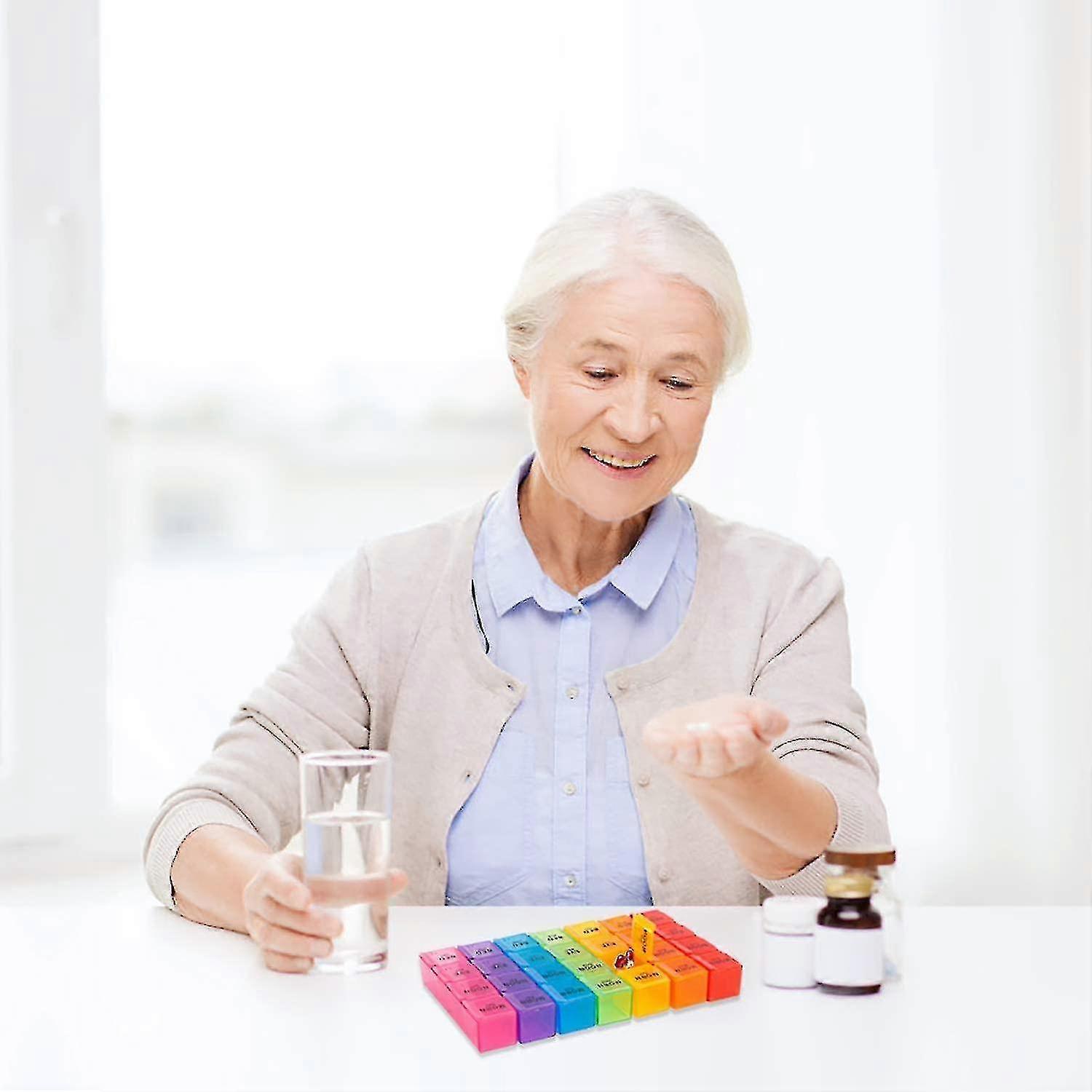 About this article. Makes Health Management Easier: No more mixing pills We have the perfect weekly pillbox with daily compartments divided into morning, afternoon, evening and evening, allowing you to simplify medication and health management. Safe and reliable: 100% PP. Push-on design allows age or children to easily open the compartment. The button stays closed when locked and closes securely to keep the pill safe. No more drug use on the floor, the pills can be kept dry for a long time, preventing moisture deterioration. Perfect for Travel: Small and perfect for travel. Also great for storing small jewelry like earrings, beads, nail art tips. Made of durable plastic, our pill organizer is lightweight and compact, so its easy to carry. Great Gift: Comes with Black Leather Pouch Great gift for seniors, athletes and anyone who needs to carefully monitor their daily medication or supplement dosage.