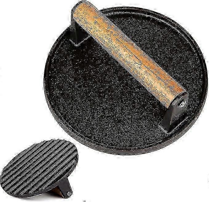 7"/17.8cm Round Cast Iron Bacon Press with Wooden Handle for Grill, Steak, Hamburgers, Sausages, Sandwiches