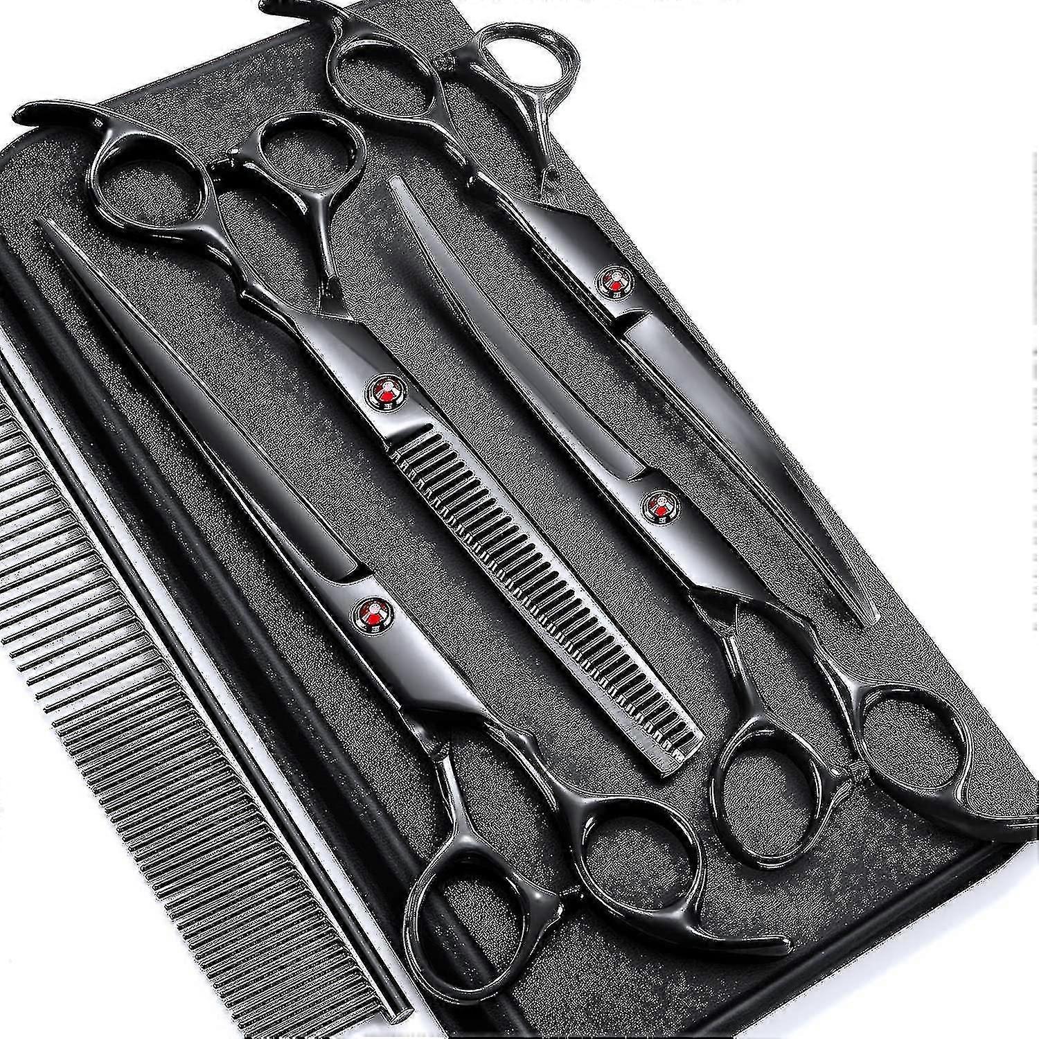 Necessary Tools for Professional Dog and Cat GroomingThe dog grooming scissors are made of 4CR stainless steel material, immersed in ceramic coating, carefully polished and ground after 60 processes, the blade is not rusted, easy to clean, and the blade is sharp for a longer time Sharp Knurled Edges & Rounded HeadsThe sharp knurled edges make the cut of these dog grooming scissors more professional, smoother and more stable, perfect for eliminating hair pads and tangles. Safety round tips to keep pets safe and won"t hurt the face and don"t scare pets Ergonomic Design, Comfortable to HoldWe also know that grooming can be tiresome, so we made the ergonomic handle to fit comfortably in your hand, your hand won"t when using scissors feeling tired and sore 7-in-1 Dog Grooming Scissors SetDog Grooming Scissors Set comes with 6.5Dog Grooming Scissors + 7Dog Downbending Scissors + 7Dog Upbending Scissors + 7Straight Grooming Scissors + 1 Comb + 1 Storage Box Professional after-sales serviceIf you are not satisfied with our products, you can contact us at any time, we will provide the most professional after-sales service