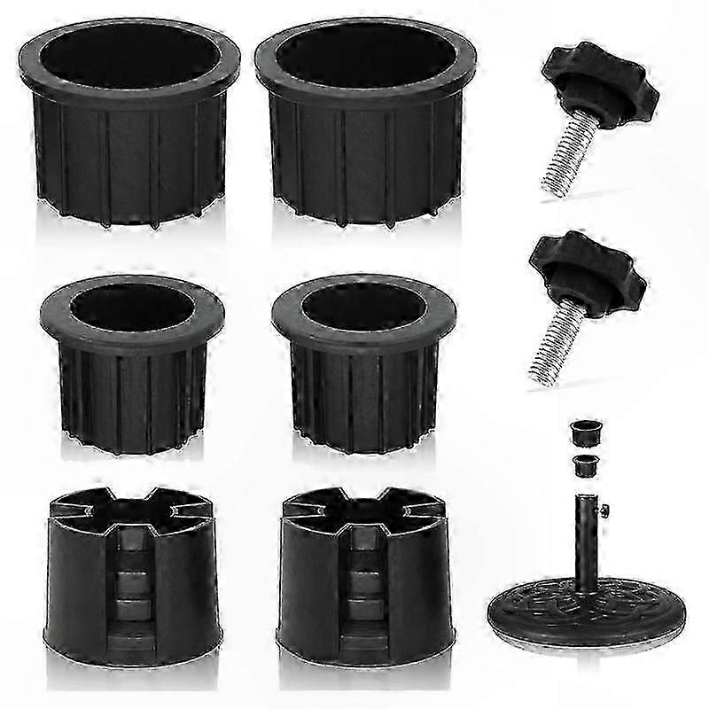 Strong Umbrella Stabilizer - These stabilizers ensure a tighter fit between the umbrella pole and stand base, helping to prevent accidents or damage to the umbrella. Easy to Install - Setup in 2 minutes with 3 simple steps: 1. Insert the base stabilizer into the bottom of the umbrella stand base. 2. Select the appropriate size from the two included ring parts (separate them first) and place it on top of the stand base. 3. Insert the umbrella into the base and secure it using the provided tightening mechanism. Wide Application - The umbrella hole ring plug fits most umbrella types, including beach umbrellas, market umbrellas, and traditional patio umbrellas. The durable materials allow use in various environments such as beaches, balconies, backyards, and poolside areas. Material: Metal + Plastic Color: Black Package Contents: 1 x Replacement Parts Kit (8 pcs) Note: The package includes only the items listed. Other products are not included. Note: Lighting and display differences may cause slight color variations between the product image and the actual item. Measurement error allowance is +/- 1-3 cm.