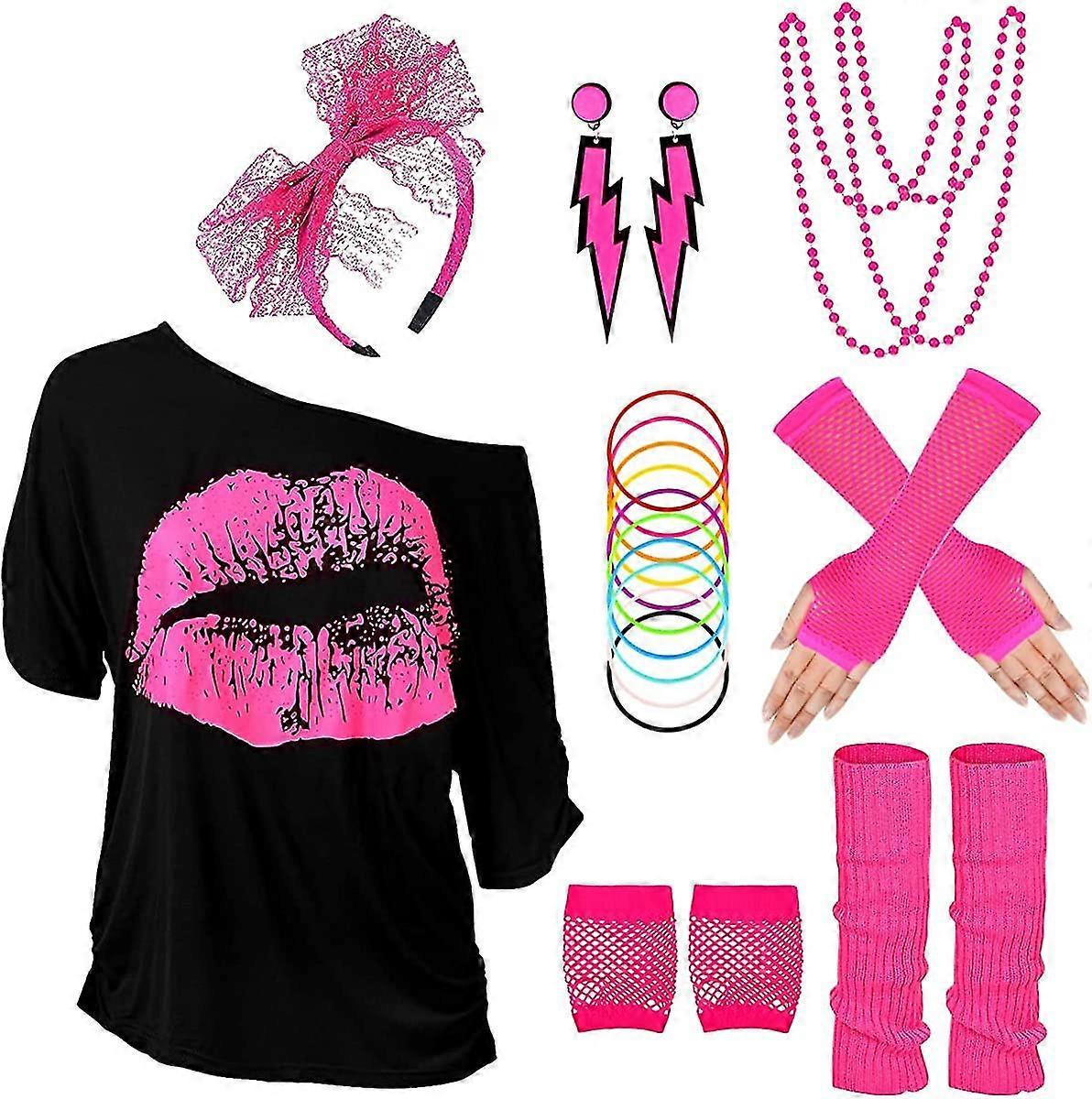80s Outfits Accessories For Women, T-shirt Headband Earring Necklace Fishnet Gloves Legwarmers For 80s Theme Party