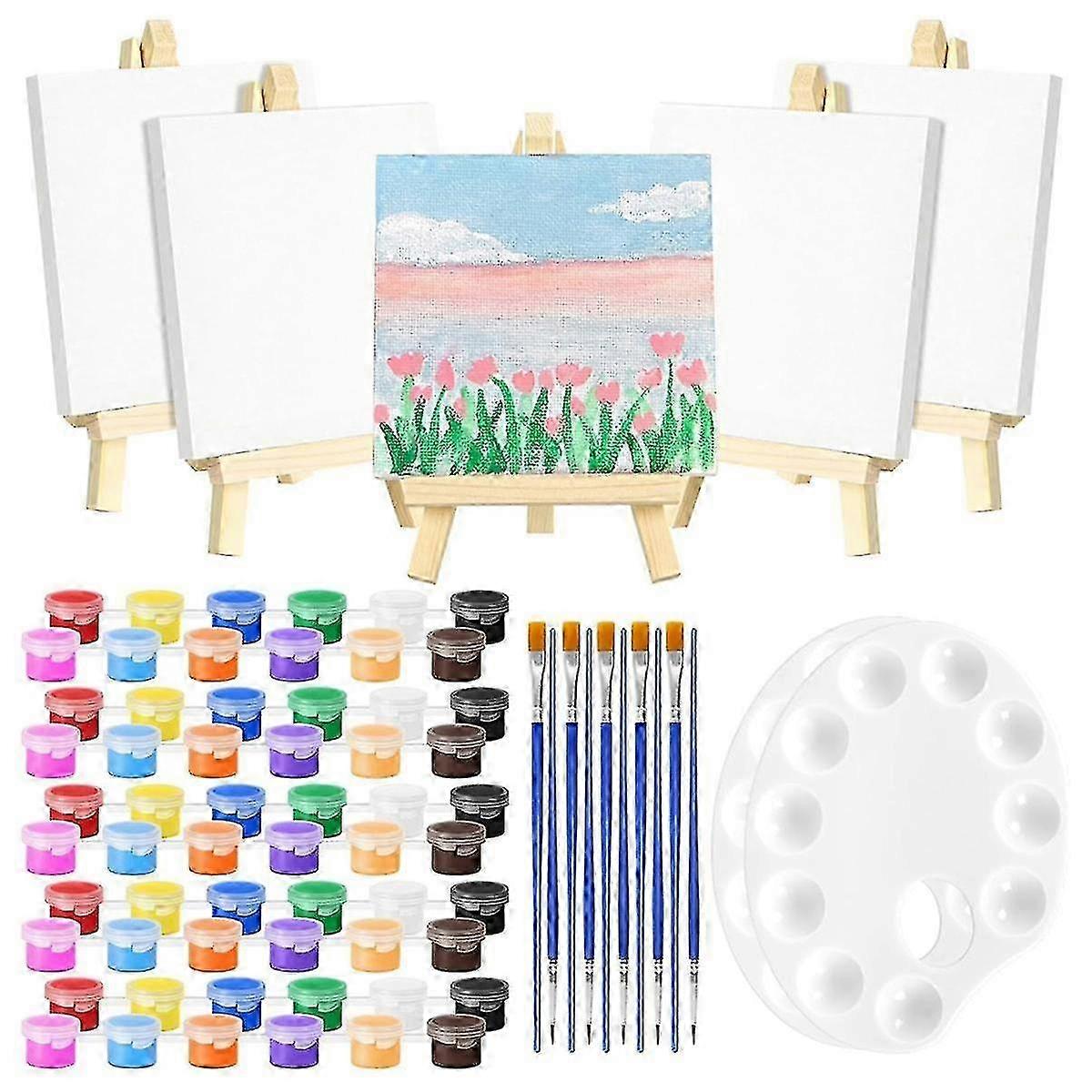 82 Piece Complete Paint Kit with Mini 4x4 Inch Canvases Wooden Easel 12 Colors Brushes for Art Students