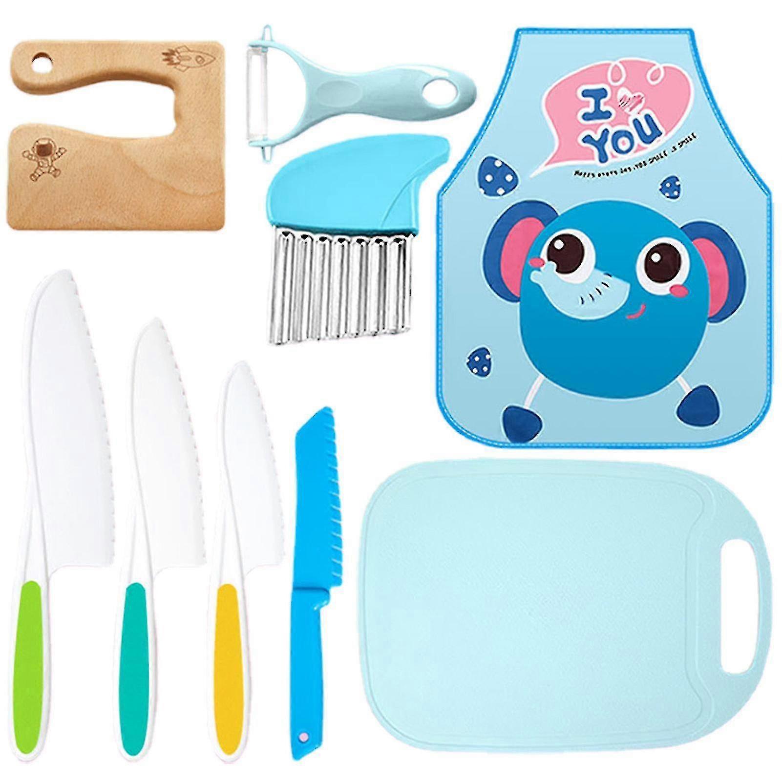 9 Pieces Wooden Kids Knifes Set Potato Wave Knife Plastic Knives With Apron Peeler Perfect Starter Knife Set-q
