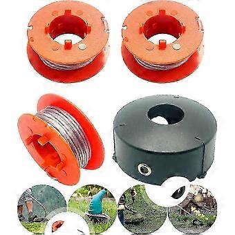 A 3-spool and 1-cover pack of an 8m x 1.6mm pro-tap automatic soft cord wire spool (F016800175) for a Bosch Art 23, 26, or 30 Easytrim or Combitrim.