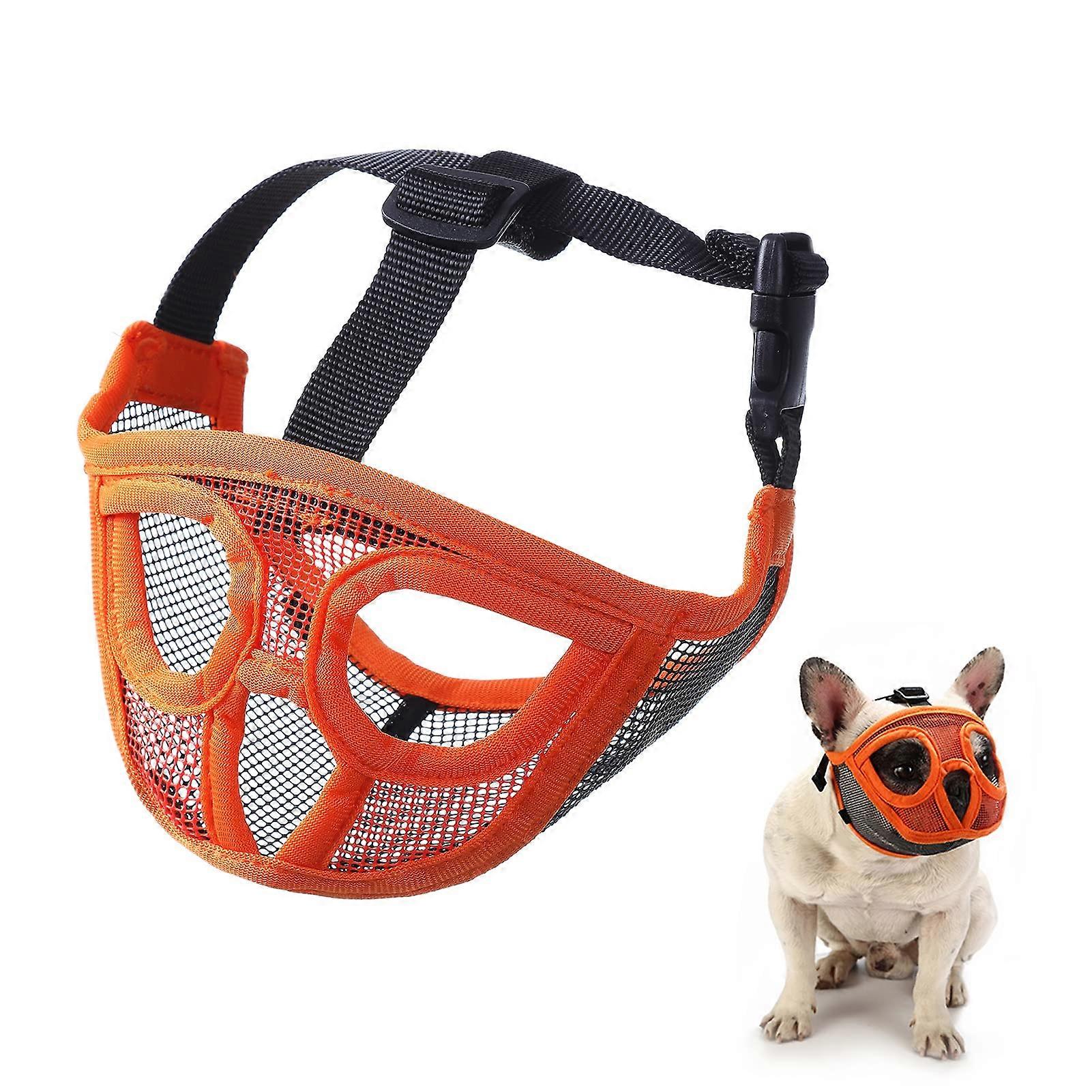 Adjustable, breathable mesh muzzle for shortsnouted dogs, suitable for training, biting, barking, orange medium.