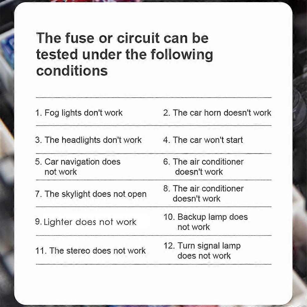 Enhance your automotive electrical diagnostics with this Professional Power Circuit Probe Tester, designed specifically for efficient maintenance and troubleshooting of vehicle electrical circuits. This compact and easy-to-use power circuit probe enables quick detection and resolution of electrical issues in cars, trucks, motorcycles, and more, making it an essential tool for automotive engineers, electronic technicians, and DIY enthusiasts. Key Features: · Professional Electrical Circuit Testing Tool: Specially designed for automobile electrical circuit maintenance and fault detection, providing accurate and reliable diagnostics to quickly identify and eliminate electrical problems. · High Sensitivity Probe with LED Light: Equipped with a precise, high-sensitivity probe tip for accessing small and awkward areas, plus an integrated LED light on the probe head to ensure clear visibility in dark or low-light conditions. · Long 6ft Cord for Convenience: The 186cm (approximately 6ft) cable length allows full coverage of the engine compartment, making vehicle electrical system inspections easier and more efficient. · Anti-Lost Needle Cover Design: Features an integrated needle guard to prevent accidental stab wounds and avoid losing the protective cover, ensuring safe and secure operation. · Durable and High-Quality Construction: Made from sturdy ABS material with premium cable wires and a reliable alligator clamp for easy connection and long-lasting use. · LCD Digital Voltage Display: Provides clear, accurate voltage readings on a bright LCD screen, easily readable in both daylight and dark environments for precise diagnostics. · Wide Voltage Test Range & Overload Protection: Supports a voltage testing range of 0.8 to 100V, suitable for various vehicle electrical circuits including batteries, charging systems, and ignition systems. Includes overload conservation function to protect the device and reduce damage during voltage or current surges. · Versatile Application: Compatible with all types of vehicles such as cars, trucks, and motorcycles, making it a versatile and indispensable tool for automotive electrical troubleshooting. Specifications: · Material: ABS · Voltage Test Range: 0.8–100V · Pen Length: 17.5cm (6.9 in) · Probe Length: 4.3cm (1.7 in) · Cord Length: 186cm (73 in) · Environmental Use Conditions: CAT.III 300V; Pollution Level: 2; Altitude < 2000m · Working Temperature and Humidity: 0~40℃ (<80% RH, <10℃ Non-condensing) · Storage Temperature and Humidity: -10~60℃ (<70% RH, battery removed) · Maximum Allowable Voltage Between Measuring Terminal and Earth: 300V · Sampling Rate: Approximately 3 times per second · Overrange Indication: Displays “OL” · Polarity Indication: Automatic display of “-” sign · Battery: 1 x 1.5V AAA battery (not included) · Item Size: 17.5 x 2.3 x 2.8cm (6.9 x 0.9 x 1.1 in) · Item Weight: 63g (2.2oz) Package Includes: · 1 x Car Voltage Tester · 1 x Cloth Bag · 1 x User Manual (English) This power circuit probe tester combines precision, durability, and user-friendly features to deliver a reliable solution for automotive electrical testing and troubleshooting. Its wide voltage range, overload protection, and clear LCD display make it an indispensable tool for anyone working with vehicle electrical systems.