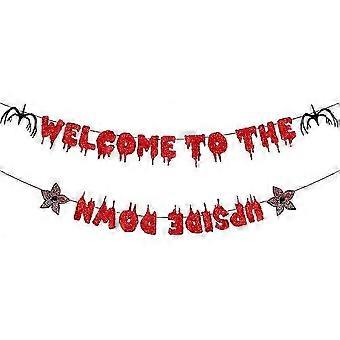 2025 Strangers Halloween -juhlien banneri Strangers-elokuvateemainen juhlabanneri Glitter Tervetuloa ylösalaisin olevaan banneriin Strangers-juhlien koristeluun