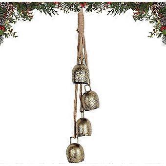Perjantaille 2024, 3 joulukellon sarja, messinkilehmän muotoinen nuhjuinen maalaismainen metalli roikkuu jättimäisiä lehmänkelloja