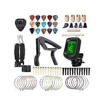مجموعة ملحقات الجيتار، 65 قطعة، مع أوتار الجيتار، موالف، كابو، ريشات، حامل ريشة، ريشات إصبع الإبهام، دبابيس الجسر