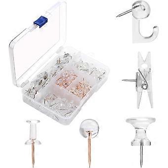 5 styles 125 counts push pins in a case. giant clear thumb tacks * 15-count, clear push pin hooks* 15-count, clear push pin clips* 15-count, rosegold map tacks*40-count, rosegold thumbtacks*40-count Used to pin important papers and messages to cork boards, foam boards, maps and more Perfect For Tacking Maps, Bulletin Boards, and Calendars. Also good for hanging ornament 125 counts packed in reusable clear container case to keep your desktop or your desk drawer organized These clear push pins crafted by provide excellent assistance in pinning your important papers and messages while keeping you organized.