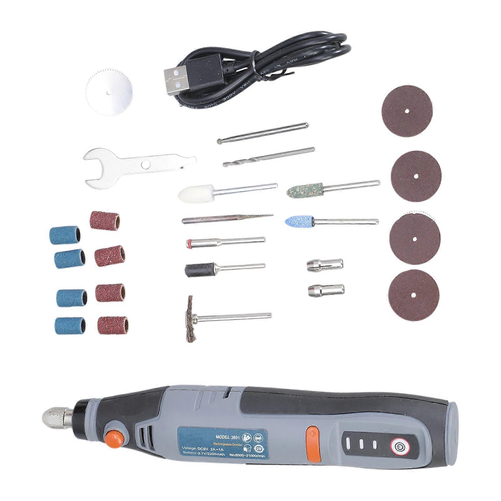 Features: This rotary tool set includes a high-performances and low-noise rotary tool with 22pcs rotary tool accessories for fine DIY work. The cordless rotary tool has 3-speed adjustments (8500 15000 21000RPM) for easier speed controling and to meets the power demands of different tasks. This cordless rotary tool has a 2200mAh battery and a usb charging type, easy to charge. This rotary tool is powerful yet small and light, giving you ultimates controling and precisions, as well as comfort, just like holding a pen. Crafted from sturdy metal, this grinder ensures durability and reliability, making it a dependable choice for professional repairs and DIY projects. Specifications: Material:Metal Speed :8500 15000 21000RPM Clamp:2.35-3mm (need to change chuck) Voltage: 3.7V Charge:USB Battery Capacity: 2200mAh Application:Engraving,carving,drilling,polishing,cleaning Package Includes: 1Set Rotary Tool note: Please allow 1mm errors due to manual measurement. Due to the difference between different monitors, the picture may not reflect the actual color of the item.