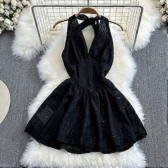 Summer Korean Style Fashionable Halter Deep V-Neck Backless Waist Slimming Sleeveless A- Line Short Fluffy Dress