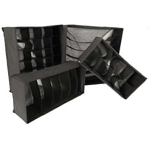 ①. DRAWER ORGANIZERS FOR UNDERWEAR, SOCKS, 4 PCS. ②. Each organizer is made of soft material and has flexible compartments - thanks to them, the whole set can be a great help in organizing your things. ③. The organizers do not have any additional fasteners or lids - so when you open the drawer, you can immediately see all your things. ④. 4 different underwear organizers. ⑤. Technical parameters: - Gray color. - Material: non - woven fabric. - Reinforced walls: yes. - Dimensions: - Small 1: 33 cm x 15.5 cm x 10 cm. - Small 2: 29 cm x 14 cm x 10 cm. - Large capacity: 32 cm x 32 cm x 10 cm. - Packaging: 37 cm x 11 cm x 8 cm.