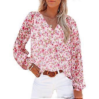 بلوزة شيفون مطبوعة بالورود بأكمام طويلة وفتحة رقبة على شكل حرف V، كاجوال وساحر للنساء، وردي XL