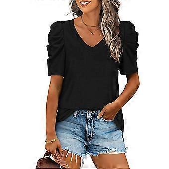 قميص نسائي كاجوال برقبة على شكل حرف V وأكمام منتفخة من القماش المرن مريح بلون سادة أنيق للصيف والمنزل والمكتب باللون الأسود مقاس S