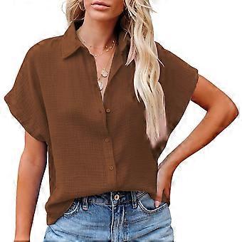 قميص نسائي قصير بأكمام خفاش وياقة مطوية وأزرار للإغلاق وبلوزات فضفاضة غير رسمية بلون نقي للارتداء اليومي، لون بني متوسط