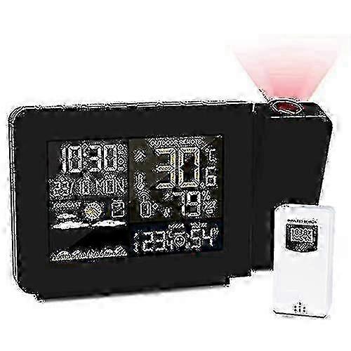 Projection Alarm Clock with Indoor or Outdoor Temperature Display, Dual Alarms, Colored Backlight, and Weather Forecast - Perfect for Bedroom Key Features of the Wireless Projection Clock with Outdoor Sensor: Wireless Remote Sensor: Connects to a wireless remote sensor for recording outdoor temperature readings and humidity around your living area. Dual Alarm Clock and Snooze: Separate switch for controlling two alarm clocks based on different schedules. Snooze function allows for 5 to 60 minutes of extra sleep after the alarm goes off. Smart Outdoor Sensor: Innovative outdoor wireless sensor ensures automatic calibration and accurate outdoor temperature data. Adjustable Brightness Projection Time and Dual Alarm: Adjust the brightness of the projection time to your preference. Dual alarms with customizable settings. High Definition Projection Clock and 180 Adjustable Angle: Ceiling projection area of 0.5 to 3 m with the best projection distance of 1.5 to 3 m. Projection angle can be adjusted 180 degrees. Optional 12 or 24-hour mode. Tilt the projector assembly to project time onto the desired wall or ceiling. Additional Information: The snooze or light button on the top controls the snooze function. Note: The clock comes with a wireless remote sensor for outdoor temperature readings. Experience the convenience of a wireless projection clock with outdoor sensor, offering accurate time, alarms, and weather information. Package Contents: 1x weather projection alarm clock 1x wireless external sensor 1x power supply 1x manual Note: Due to the light and screen setting difference, the item's color may be slightly different from the pictures. Please allow slight dimension difference due to different manual measurement.