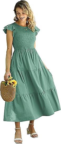 Women Summer Ruffle Cap Sleeve Casual Dress Boho Smocked Bodice Maxi Dress With Pockets E05