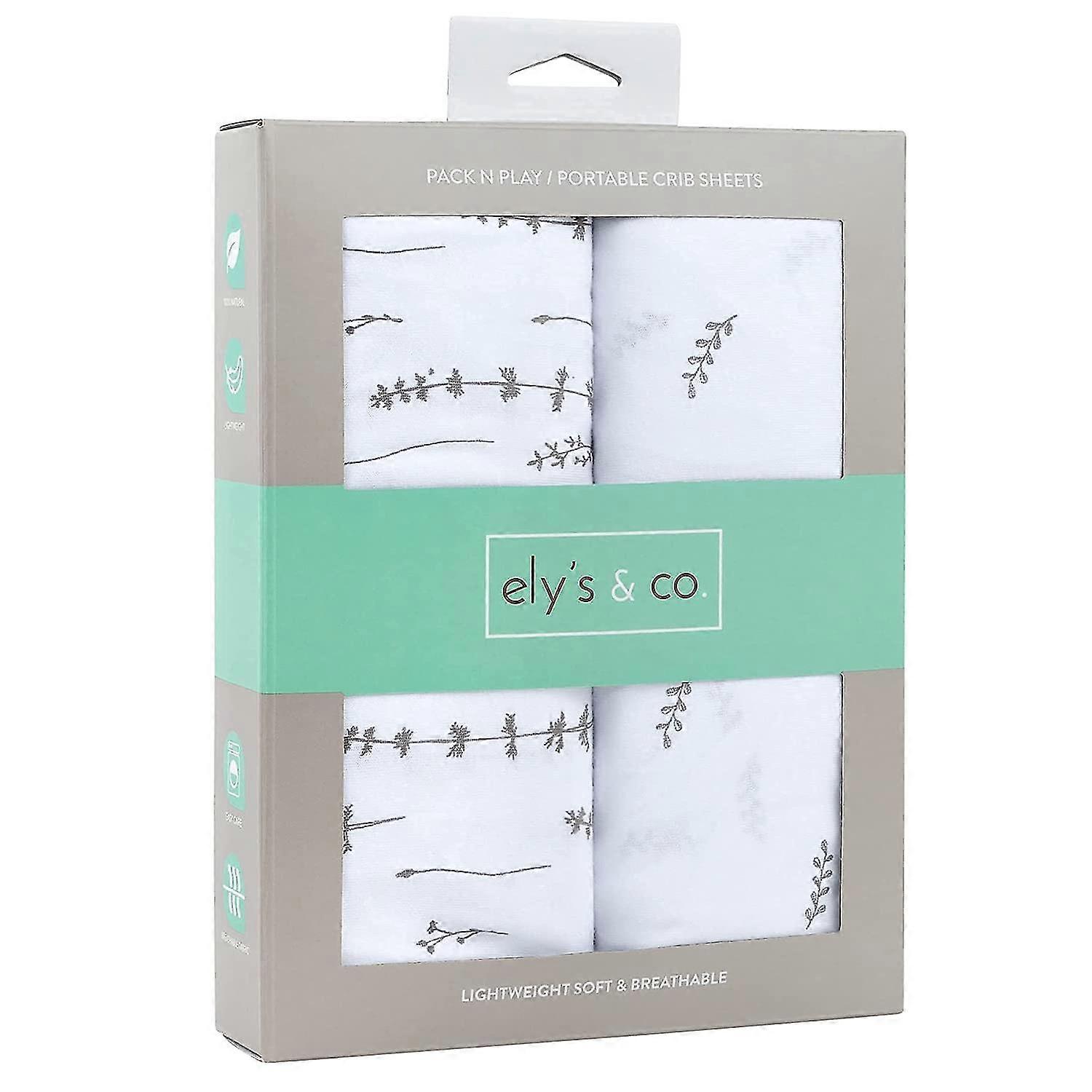 Cotton Flexible-Fit Pack N Play Sheet 2-Pack for Baby Girl or Boy in Forest Grey Floral and Leaves! Bundled in our charmingly cute and compact packaging, this sweet and charming pack & play sheet set makes for the perfect baby shower gift! These soft and snuggly playard sheets feature a modern and neutral forest grey scattered leaves design paired with a contemporary floral print, both set on white. You can be rest assured that your baby\u2019s sleep surface will always be covered with a clean, trendy, and soft cotton sheet. Show us how you style this gorgeous nursery bedding set by tagging Ely\u2019s & Co. on social media! Our Pack N Play sheets\u2019 innovatively designed elastic band offers an adaptable stretch while supplying a safe and secure, snug fit to playard and portable crib mattresses. 100% High Quality Combed Jersey Knit Cotton \u2013 Lightweight, Soft & Breathable \u2013 Machine Washable, Dryer Safe. Dimensions: 24\u201d x 38\u201d x 5.\u201d Flexible Fit. Fits all Standard Pack N Play, Portable Crib, Mini Crib and Playard Mattresses.