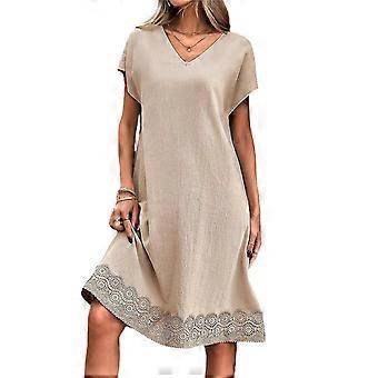 الصيف المرأة فستان V الرقبة قصيرة الأكمام فضفاضة الدانتيل خليط لون نقي طول الركبة كنزة صوفية عارضة ارتداء يوميا فستان ميدي