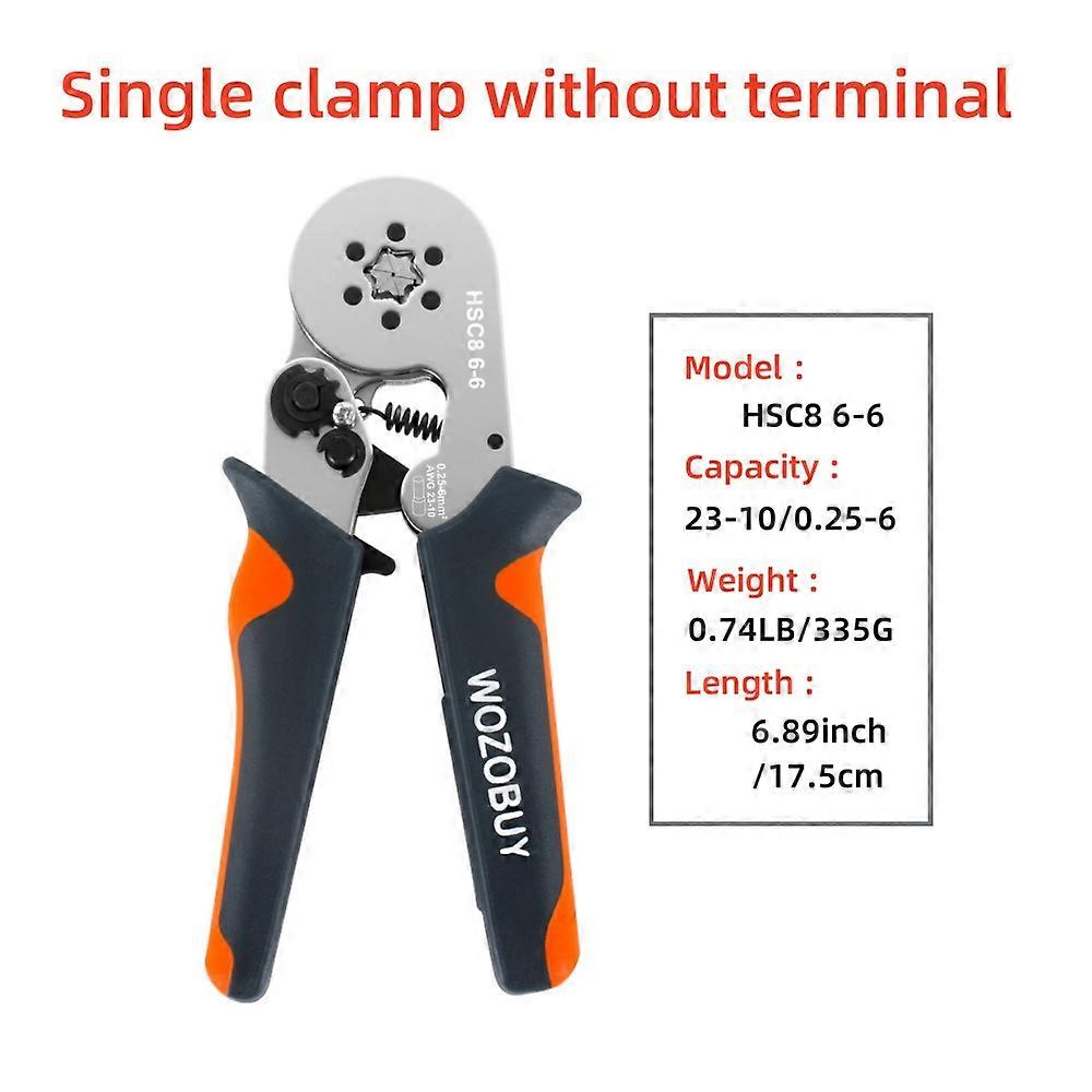[DETAIL] Durable and compact wiring terminals capable of working with both insulated and uninsulated connectors, perfect for small DIY projects and large electrical repairs with a crimping area of AWG23-10 0.25-6mm² The ferrule crimping tool automatically adjusts to the proper diameter of the terminal, making it easy to operate and saving electricians and assemblers valuable working time The ratchet self-adjusting design ensures the tool strips terminals accurately and reliably, avoiding wasted terminals during crimping With this ferrule crimping tool kit, you can complete wiring projects quickly. It is suitable for all types of equipment such as switches, batteries, cars, household appliances, and electronic components with pins [ATTRIBUTES] - Hign-concerned Chemical: None - Features: Mini - Application: Crimping - Hign-concerned Chemical: None - Features: Mini - Application: Crimping - Type: Round Nose - Origin: Mainland China - Plier Style: Chinese - Brand Name: WOZOBUY - Material: Carbon Steel - DIY Supplies: Electrical
