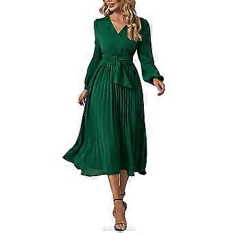 لف فستان مطوي على شكل V رقبة كم طويل لون عادي كم منفوخ الخصر الرقبة الزائدة فستان مطوي أخضر XXL