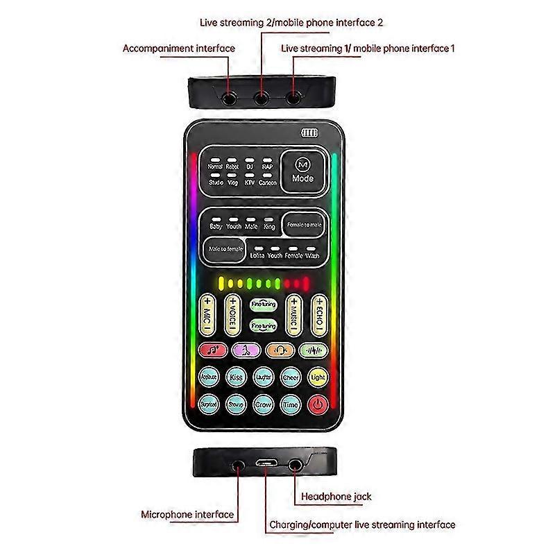 Fangrui Product Details 16 Electric Tones. In The Electric Mode You Can Sing A Song With 16 Sound Effects, Rich Gameplay Experience Intelligent Modification Of Sound.anti External Interference, With Noise Reduction Function 8 Live Sound Effects To Control The Room. 8 Kinds Of Warm-up Sound Effects.easy To Heat Up The Atmosphere Of The Live Broadcast, Live Interesting Bluetooth-compatible Accompaniment Mission. High Quality Bluetooth-compatible Mission. Simple And Convenient, Enjoy The Music Mobilephone Size And Ultra-thin Body. Just Need A Mobilephone With The Sound Card, A Headset, You Can Live Broadcast Any Time Anywhere. Plug And Play, For Androids/ Mobilephone Pc Universal, Regardless Of The Brand Model Equipments Preset A Variety Of Popular Modes. Male To Female/female To Male/child Sound/live With Goods/shouting Mai As You Switch, Sound More Lifelike Due To Different Batches, The Appearance, Color And Printed Words Of The Product May Vary, Which Will Not Affect The Use. Type: Sound Card Power Supply: High Rate Lithium