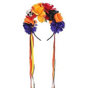 Day of the Dead Headband with Vivid Rose Garlands and Rainbow Tassel Ribbons for Halloween
