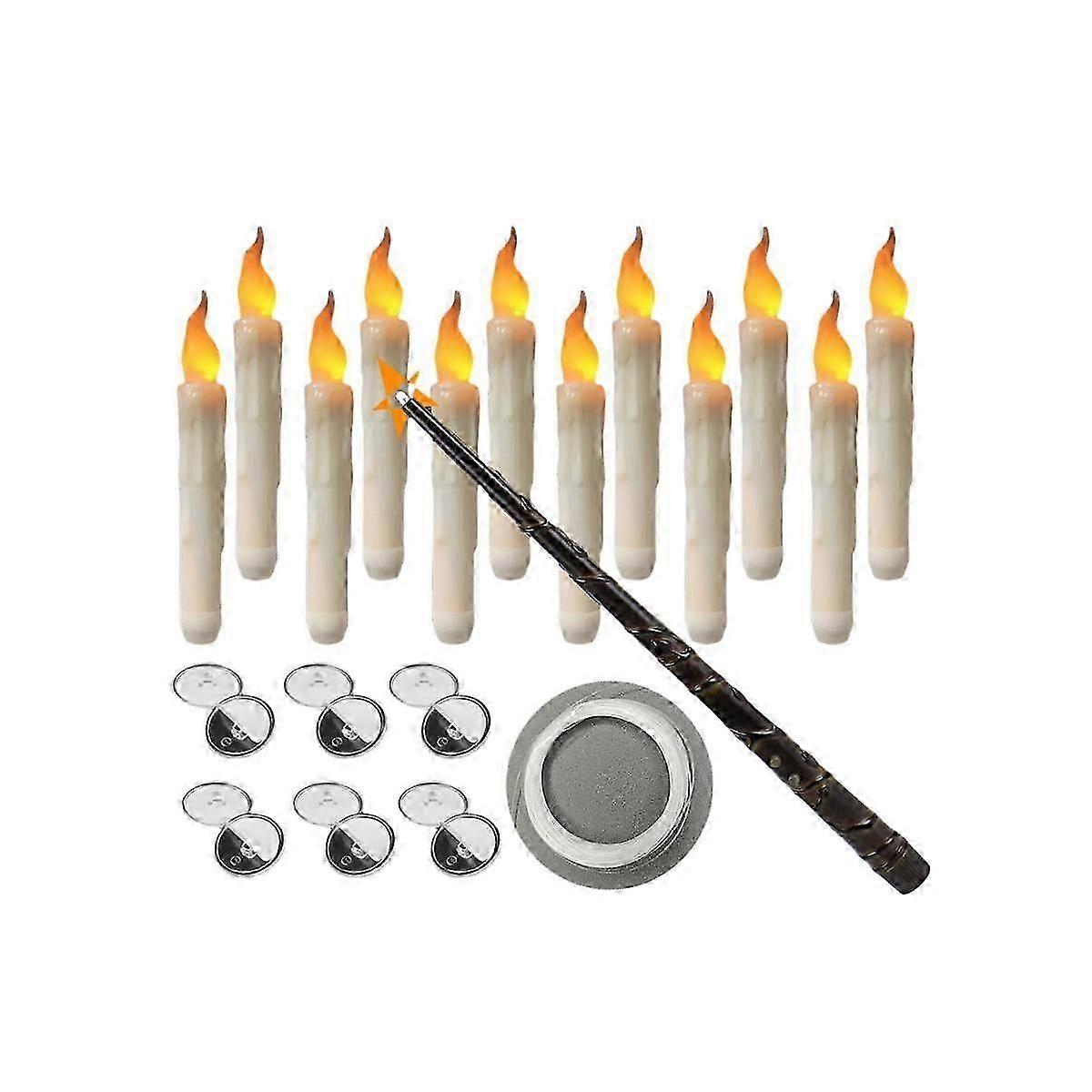 Multi-Functional Decor: Our Homery floating flameless candles are not only perfect for Halloween party decor, but also versatile enough to be used as window candles for any themed party. With the included wand remote control, you can easily create a magical atmosphere with just a wave of your handEasy Installation: Love the flickering light of the flying candles? Our flameless taper candles come with a 164FT fishing line and sticky hooks, making it incredibly easy to hang them in various ways to create a floating effect. The simple design and included installation materials ensure a hassle-free setupMagical Experience: Just like casting a spell in the magic world, our magic deco candles with the wand remote control provide an enchanting experience for both kids and adults alike. Give the wand a wave and watch as the candlelight turns on and off, creating a truly mesmerizing ambiancePerfect Atmosphere: The warm white flickering light emitted by our flameless taper candles adds a touch of magic to any space. Whether it's for a themed party or simply to create a magical atmosphere at home, these candles are the perfect addition. Illuminate your night ceiling, wall, fireplace, bedroom, or any other room that needs a bit of enchantmentExquisite Decoration: Not only are these floating candles perfect for Halloween decor and themed parties, but they also make exquisite decorations for various occasions. With the included wand remote control and everything you need for installation, these candles can bring joy and charm to holidays, Christmas, birthdays, churches, schools, weddings, and more. Add a magical touch to any room and create unforgettable memories Product DescriptionFeatures:1. Smokeless, no flame, to avoid the occurrence of flame ignition2. The lighting time is long, equivalent to 10-20 times the lighting time of ordinary candle3. Beautiful and generous, suitable for various candlesticks4. Simulate candle design, with flickering candle bands5. 2*AA/1*AAA batteries are used, which are durable and easy to replaceSpecification:Material: plastic + LEDProduct size: candle: 2*17cm magic wand: 2*33.2cmAppearance color: white shellLight color: yellow flashing/warm white flashingBattery: candle 2*AA battery, magic stick 1*AAA battery (sent without battery)Switch: turn the switch and it will light up when tightenedPackage includes:12/20pcs LED floating candleswithout battery)Magic wand * 1(Sent without battery)