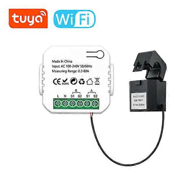 This intelligent WiFi Tuya energy meter measures the amount of energy produced by your solar system and the amount of energy it consumes by monitoring the application. Controlled by the Tuya application, the app displays in real-time the power, current, voltage, power factor, and frequency of the forward and reverse channels. Supports automatic setting of switch values and push notifications, and the device can be calibrated by adjusting the percentage. Mobile Application Control: The app displays the power, current, power factor, and frequency of the forward and reverse channels. Power Statistics: The APP program displays daily, monthly, and reverse and forward data for the channels individually. Displays the percentage of electricity consumption to avoid abnormal electricity usage. Automation Function: You can define the power or current value in the app; the device will start working only when the power or current exceeds the set value. Feature-Rich Design: Automatic values and push notifications, and the device can be calibrated by adjusting the percentage. Easy Installation: Mounts on a 35mm rail, no need to replace cables, connection is safer, just insert the cables into the clamp and measure. Specifications: Name: WiFi Tuya Energy Meter Material: PC Type: 1CT, 2CT (optional) Current: 0.2-80 A Precision Level: 1.0 Operating Current: -10℃ to 55℃ Wireless Type: 2.4 GHz Item Size: 47 * 47 * 18 mm / 1.85 * 1.85 * 0.71 inches Package Size: 1CT: 100 * 100 * 30 mm / 3.94 * 3.94 * 1.18 inches 2CT: 115 * 115 * 40 mm / 4.53 * 4.53 * 1.57 inches Package Weight: 1CT: 150 g / 5.29 ounces 2CT: 200 g / 7.05 ounces Pack List (1CT): 1 * WiFi Energy Meter 1 * CT or Pack List (2CT): 1 * WiFi Energy Meter 2 * CT