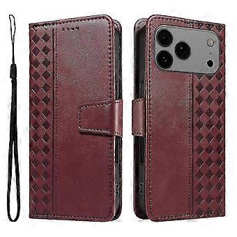 iPhone 17 Pro Max Leather Wallet Case with Grid Printing & Strap, Wine Red Color, Compatible with Apple Devices