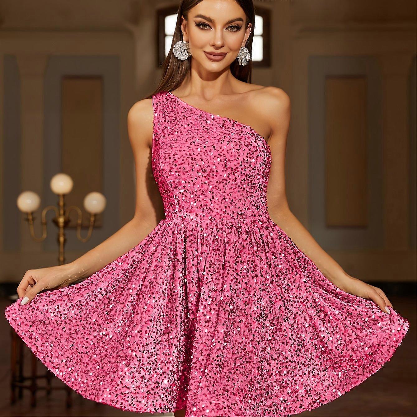 JUNGE Solid One Shoulder Mini Dress, Elegant Sleeveless Sequin Dress For Party & Club, Women's Clothing SZJG240306