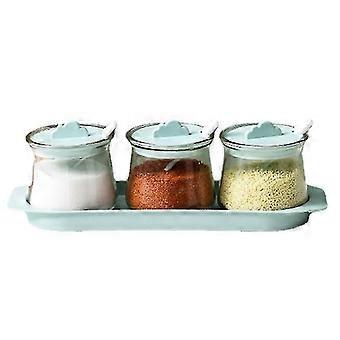 Made of high-quality material, it can store salt, sugar, pepper, and dry medicine more safelySeasoning container: each seasoning pot can be used as a sugar, salt bowl, flour, pepper box, and a right-hand man to make the kitchen look cleaner and tidy. Make kitchen work more efficientMulti-scene application: suitable for various scenes such as family, hotel, coffee shop, party, restaurant, etc., elegant green porcelain, simple design. Also suitable as a housewarming gift to friendsElegant design: Meet your different needs without making a mess in your beloved kitchen Thoughtful design adds a spoon and detachable lid to each storage container to prevent moisture and dustType: Spice jar storageSize: 30.6 x 9.8 x 11cmcolour:Transparent+blueMaterial:PP+glassPackage Contents:3 x spice storage jar3 x lid3x mini spoon1 x trayOnly the above package content, other products are not included.Note: Light shooting and different displays may cause the color of the item in the picture a little different from the real thing. The measurement allowed error is +/- 1-3cm.
