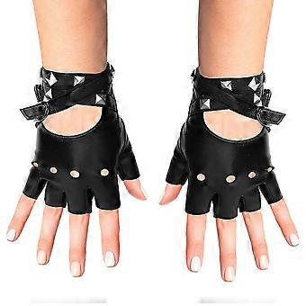 قفازات جلدية صناعية بدون أصابع - قفازات فاسق لراكب الدراجة الأسود مع حزام للإغلاق وتصميم مرصع