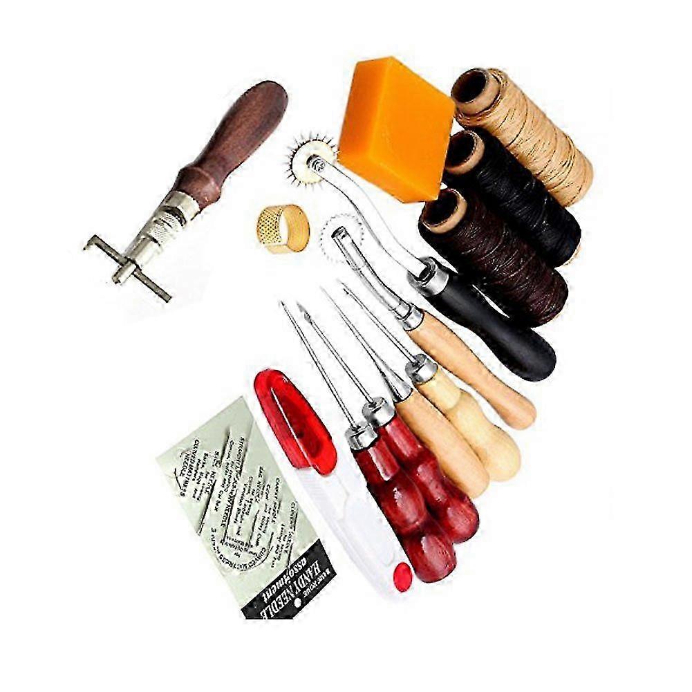 14-Piece Leather Craft DIY Tools Kit for sewing leather, fabric, denim, canvas or tarpaulin. This practical set is ideal for custom leather projects and mixed-material crafts such as sewing leather, canvas, cloth or paper. What’s included - 1Pc black pressure cloth tooth distance of 4 mm - 1Pc log pressure cloth tooth distance of 2 mm - 1Pc solid wood awl - 1Pc straight head awl - 1Pc hook the awl - 1Pc hollow awl - 1Pc grooving device - 1Pc beeswax - 1Pc thimble - 1Pc leather needle - 1Pc ecru flat wax rope - 1Pc black flat wax rope - 1Pc coffee flat wax rope - 1Pc scissors Durable and easy to use - Made of steel and wood for long lasting performance - Two types of pressure cloth tooth and multiple awls plus a groover enhance punching and stitching efficiency - Includes beeswax to smooth thread and reduce friction Protection and versatility - Finger cots or thimble ring help protect beginners from injury - Suitable for both experienced crafters and beginners with proper protection Use scenarios - Create or repair leather items such as belts, wallets, bags, and straps - Stitch canvas, denim or mixed-material projects like backpacks, jackets, or patches - Repair seams, reinforce edges, or replace stitches on leather footwear and gear This complete kit provides essential tools for reliable stitching, precise grooving, and durable results across common leather and fabric projects.