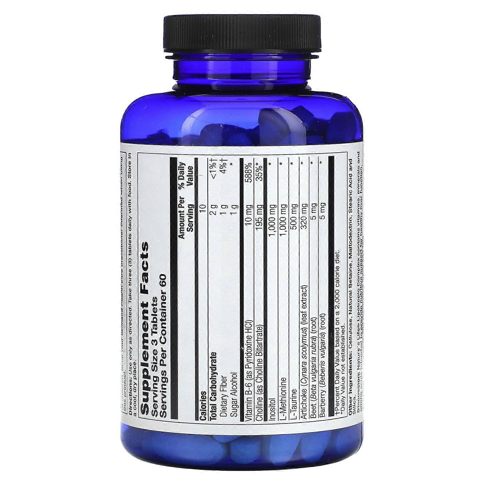 مكونات: Cellulose, natural betaine, maltodextrin, stearic acid and silica. Supplement Facts Serving Size: 3 Tablets Servings Per Container: 60 Amount Per Serving %Daily Value* Calories 10 Total Carbohydrate 2 g <1%† Dietary Fiber 1 g 4%† Sugar Alcohol 1 g * Vitamin B-6 (as Pyridoxine HCl) 10 mg 588% Choline (as Choline Bitartrate) 195 mg 35%* Inositol 1,000 mg * L-Methionine 1,000 mg * L-Taurine 500 mg * Artichoke (Cynara scolymus) (leaf extract) 320 mg * Beet (Beta vulgaris rubra) (root) 5 mg * Barberry (Berberis Vulgaris) (root) 5 mg * †Percent Daily Value based on a 2,000 calorie diet. *Daily Value not established.