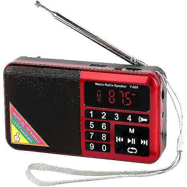 Mini Portable FM Radio USB Micro-SD and Built-in MP3 Player, LED Flashlight, 1500mAh Rechargeable (red)