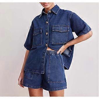 ريترو عارضة فضفاضة جيب قصيرة الأكمام قميص شورت الدنيم بدلة من قطعتين