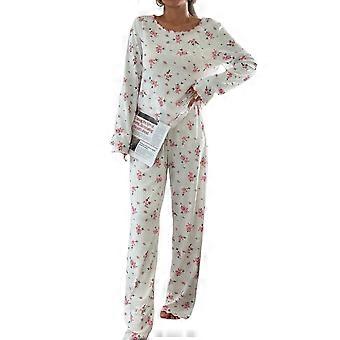 Women'S Floral Print Round Neck Long Sleeve Loungewear Set Pajamas Two Piece Sleepwear Pants White L