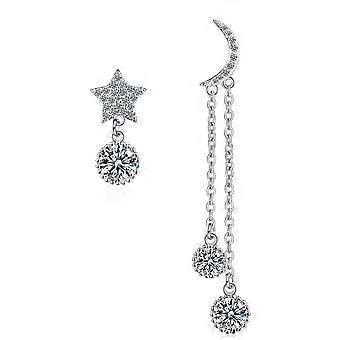 Earrings, Asymmetric Pentagram Star Moon CZ Inlaid Tassel Drop Studs