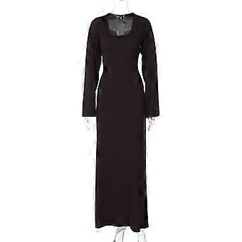 فستان طويل الأكمام Bodycon U رقبة مضيئة كم ربطة عنق خلفية ضيق ضيق عصري نقي اللون مضلع صالة Bodycon فستان ماكسي بني L