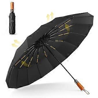 Suuri myrskynkestävä sateenvarjo musta XXL automaattinen tuulenpitävä puisella kahvalla kahdelle hengelle, halkaisija 108 cm, 16 kylkiluuta