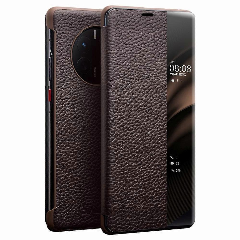 QIALINO For Huawei Mate 50 Pro 4G View Window Genuine Leather Folio Flip Phone Case Touch Slide Butt