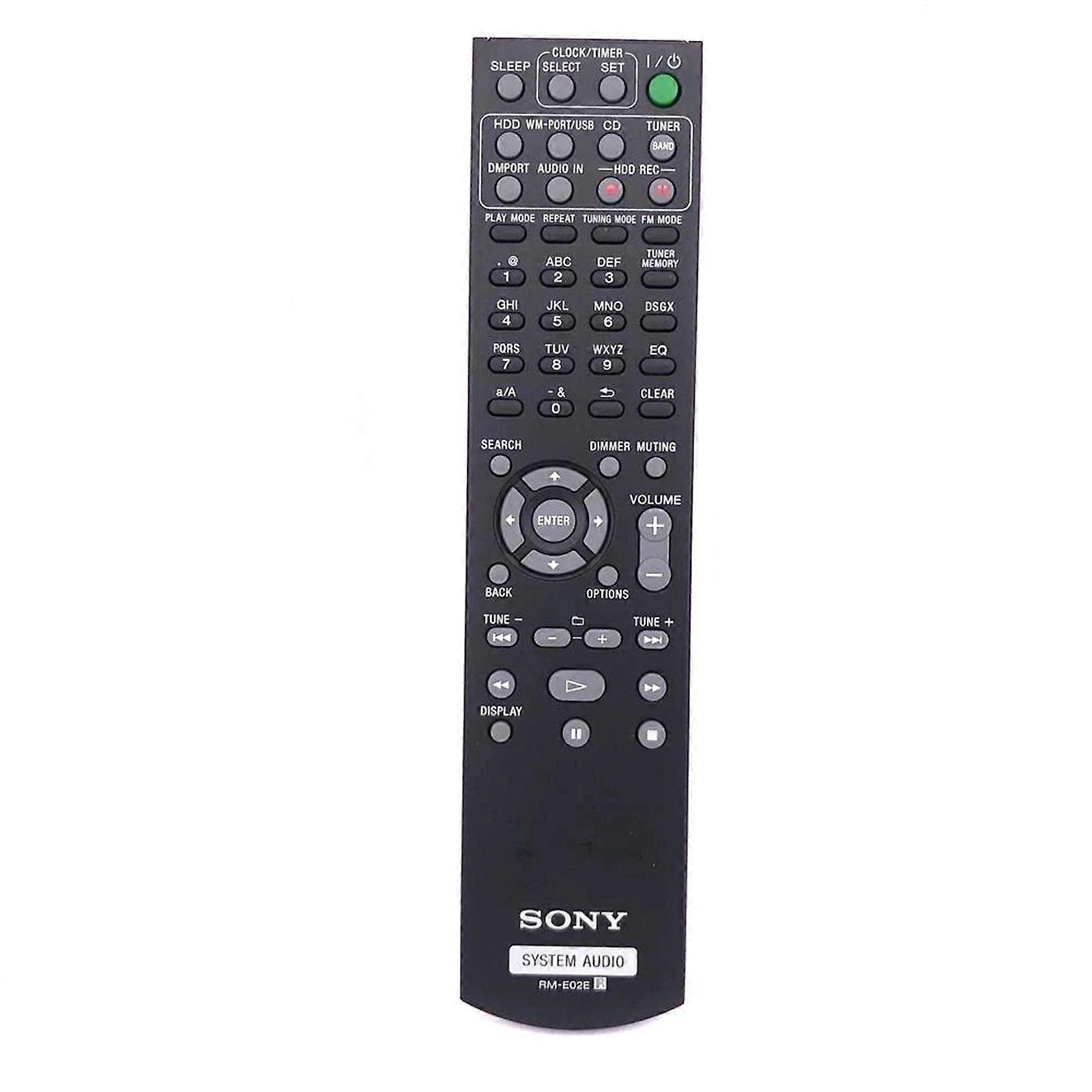 Replacement IR remote for Sony System Audio; optimized for daily operation. Compatible Sony System Audio models: HCD-E300HD RME02E 3Ft6ulhhg 2B1a0; Remote control models: RM-E02E Stable IR transmission up to 10 meters with quick key response. Durable ABS body with clearly labeled buttons for comfortable use. Quantity: 1 x remote control (batteries are not included).