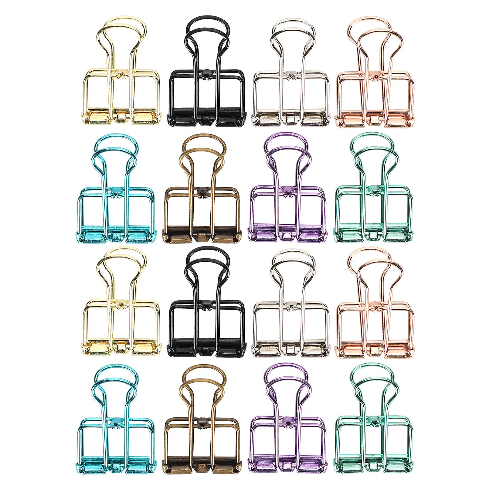 Features 1、Suitable for fixing small objects, as a snack bag sealing, suitable for organizing data files. 2、Metal texture, strong and powerful, easy to clip paper, special hollow shape and durable. 3、The design sense of hollow lines is clean and neat, suitable for storage and arrangement of notes, logs and etc. 4、Using electroplating process, which makes it has bright colors and also not easy to rust. 5、Made of high‑quality spring iron wire material and refined with elastic spring technology, with good elasticity, novel and simple style. Specification Item Type: Hollow Binder Clips Material: Iron Wire Color: 2Pcs Blue, 2Pcs Silver, 2Pcs Black, 2Pcs Gold, 2Pcs Rose Gold, 2Pcs Purple, 2Pcs Green, 2pcs Bronze Functions: Collate and classify office and study documents Process: Iron wire plating Package List 16 x Hollow Binder Clips