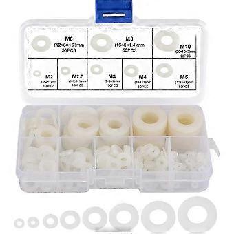 500 kpl muovisia aluslevyjä, nailonisia litteitä aluslevyjä, M2 / M2.5 / M3 / M4 / M5 / M6 / M8 / M10, valkoinen tiiviste, 26–27 kpl